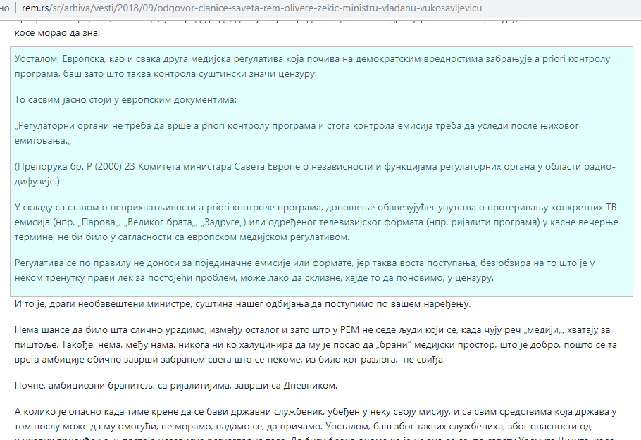 „Tačno je da evropska, kao i svaka druga medijska regulativa koja počiva na demokratskim vrednostima zabranjuje a priori kontrolu programa, jer takva kontrola znači cenzuru. To sasvim jasno stoji u evropskim dokumentima: