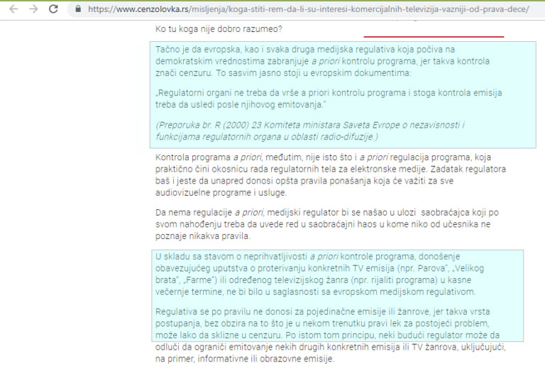„Uostalom, Evropska (sic!), kao i svaka druga medijska regulativa koja počiva na demokratskim vrednostima zabranjuje a priori kontrolu programa, baš zato što takva kontrola suštinski znači cenzuru.