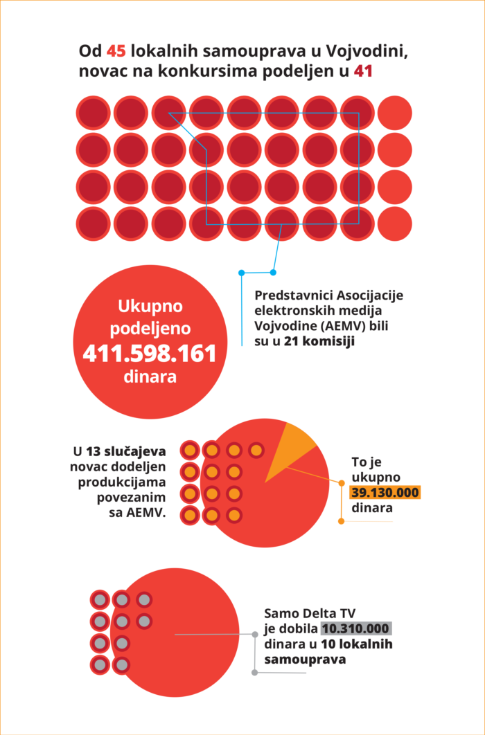 U gotovo trećini opština u pokrajini predstavnici Asocijacije elektronskih medija Vojvodine (AEMV) u lokalnim komisijama dodeljivali su budžetski novac jedni drugima kao i televiziji u vlasništvu biznismena iz Šida Aleksandra Vinčića s kojim su poslovno povezani, pokazuje istraživanje BIRN-a.