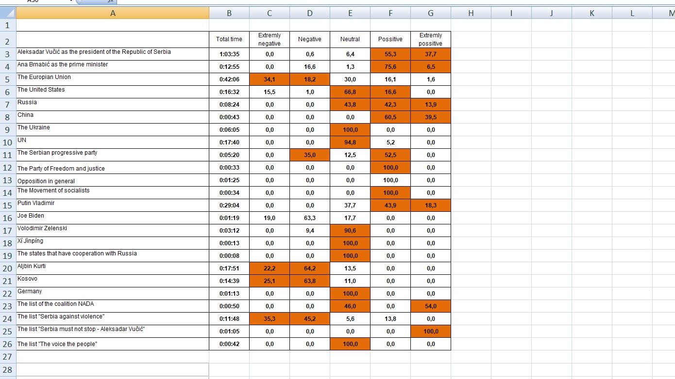 Rusija je imala oko osam i po minuta, od čega neutralno 43,8 odsto, pozitivno 42,3, a ekstremno pozitivno 13,9 odsto.