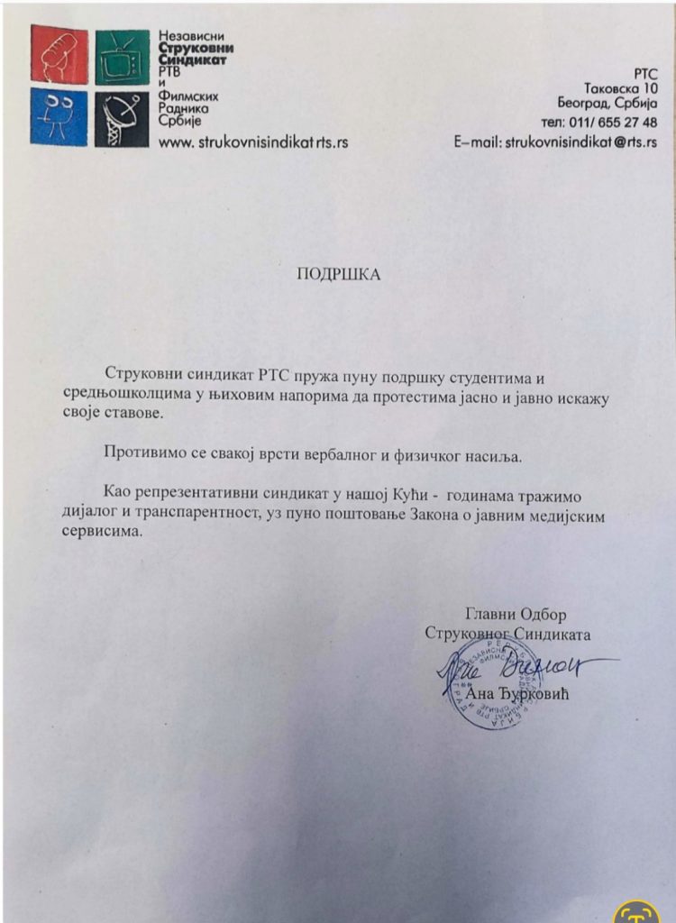 Kako je Strukovni sindikat RTS naveo u saopštenju, protive se svakoj vrsti verbalnog i fizičkog nasilja.