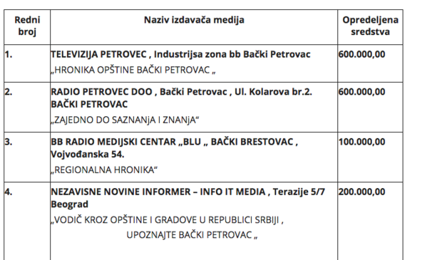 Iako na prvu loptu deluje da je reč o relativno malim sumama, ovi mediji su već dobili novac u nekoliko opština, a ima pouzdanih informacija da i dalje mogu da računaju na podršku opštinskih kasa po Vojvodini. Recimo, Informer je dobio 100.000 dinara u opštini Novi Bečej za finansiranje projekta „Opštine i gradovi u Srbiji, upoznajmo opštinu Novi Bečej“, i za isti takav projekat u Bačkom Petrovcu 200.000 dinara.