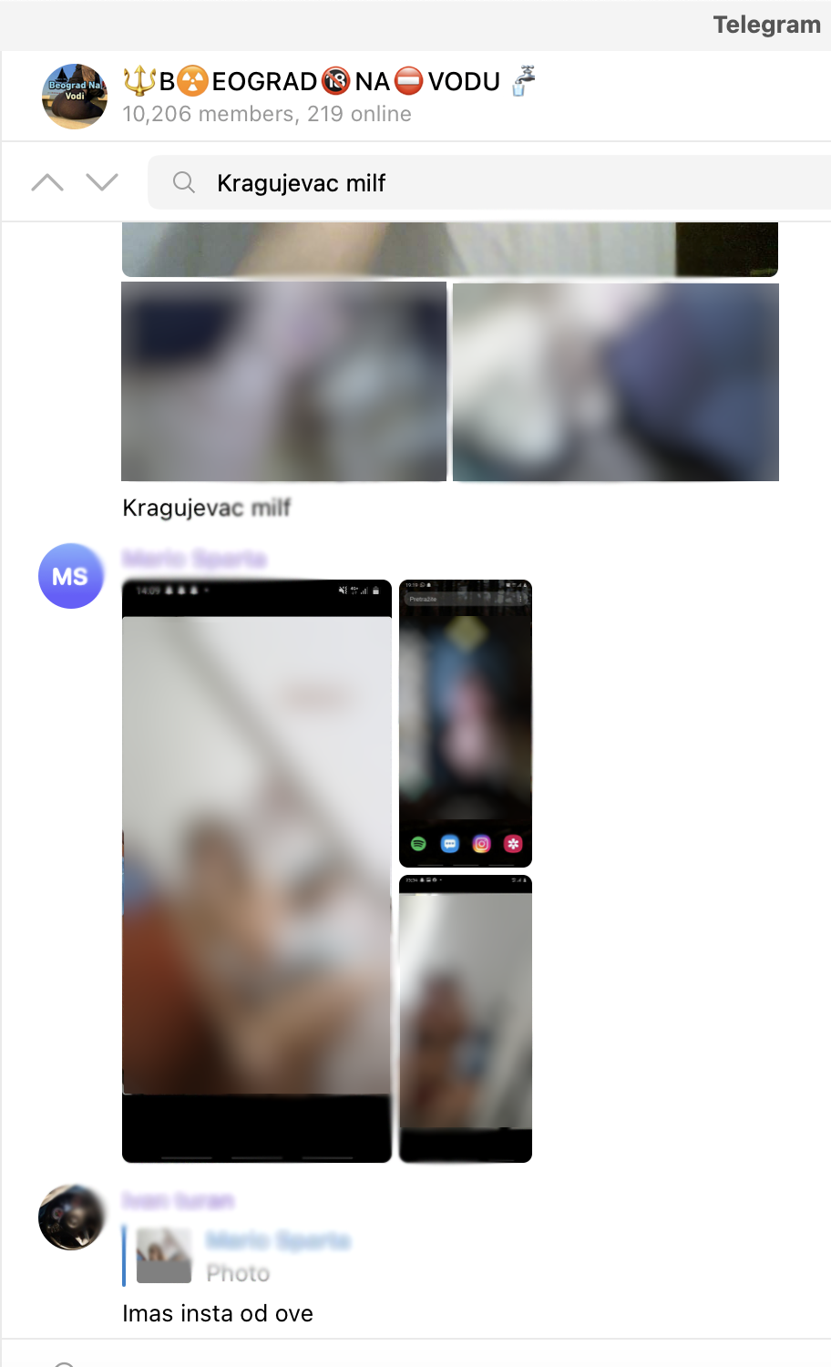 „Objavio je snimke u nekoj zatvorenoj Telegram grupi gde samo ulaziš ako imaš invite (poziv) i ta grupa je na nivou Evrope, gde takvi bolesnici kao što je on snimaju krišom ljude, svoje devojke i šalju jedni drugima“, objašnjava Jelena za BIRN.