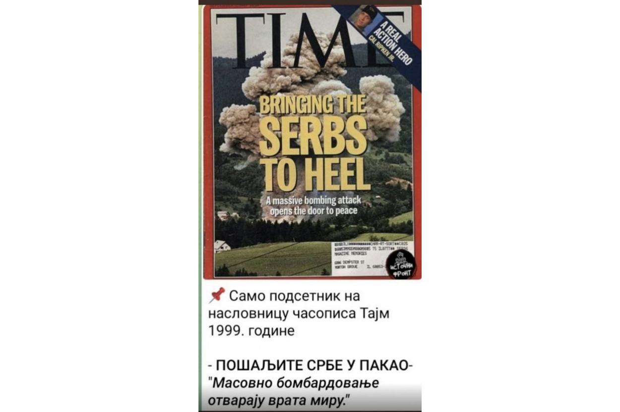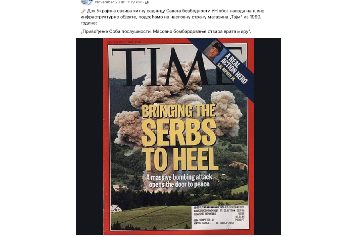 Na Fejsbuku se poslednjih dana ponovo deli čuvena naslovnica američkog magazina „Time” sa naslovom „Bringing the Serbs to heel – A massive bombing attack opens the door to peace”, uz netačnu tvrdnju da je objavljena 1999. godine. Dezinformacija je upotpunjena kontekstom u kojem se navodi da je povod za podsećanje to što „Ukrajina saziva hitnu sednicu Saveta bezbednosti UN zbog napada na njene infrastrukturne objekte”.