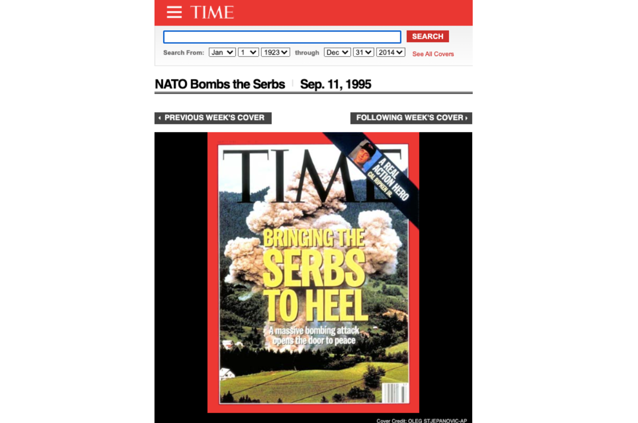 Sporna naslovnica magazina „Time”, međutim, nije objavljena 1999. godine i nema veze sa NATO bombardovanjem bivše Jugoslavije. Izdanje je objavljeno 11. septembra 1995. godine i tiče se NATO bombardovanja Republike Srpske.
