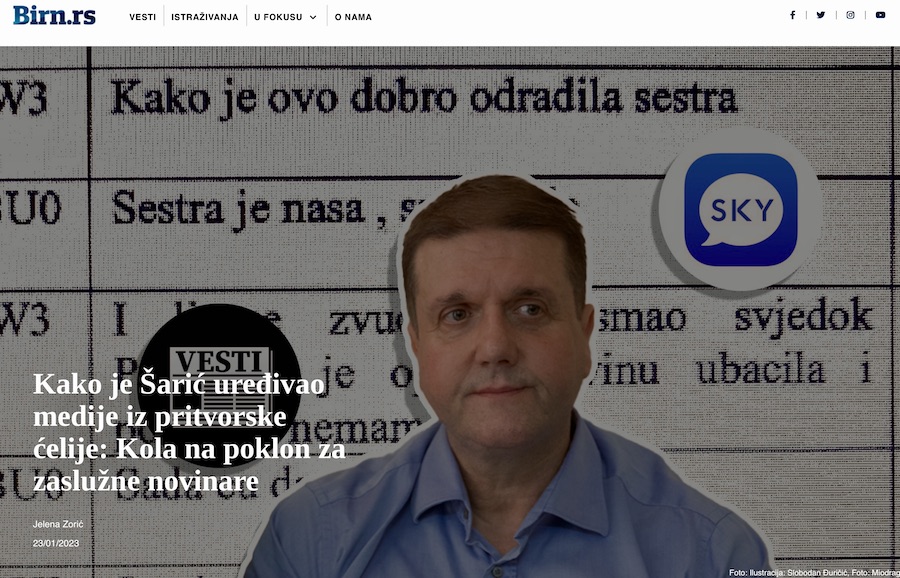Tekst istraživačke novinarke Jelene Zorić kaže da je, koristeći Skaj aplikaciju na telefonu, optuženi Darko Šarić preko svog advokata i kuma, naručivao tekstove i TV priloge, menjao naslove, ispravljao „greške“ u Alo, Kuriru, Blicu, na Pinku i TV Hepi, ali i još nekim medijima koji nisu tačno navedeni.