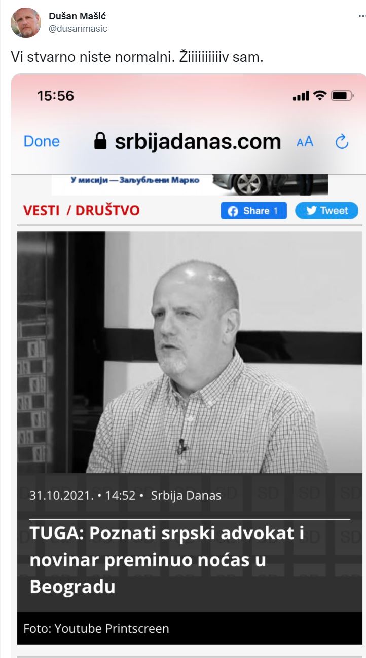 „Vi stvarno niste normalni. Žiiiiiiiiiiv sam“, odgovorio je Mašić na Tviteru.