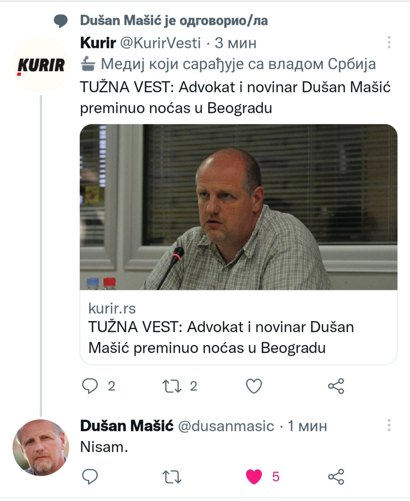 Da je Mašić živ dokazuje i to da je Mašić uredno odgovorio i na telefonski poziv Nove.rs.