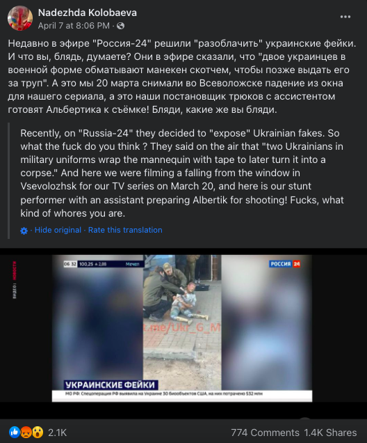 Članovi filmske ekipe, koji se vide na snimcima koje je objavila Kolobajeva, nose istu odeću kao i ljudi prikazani u snimku koji je emitovan na kanalu Rusija-24.