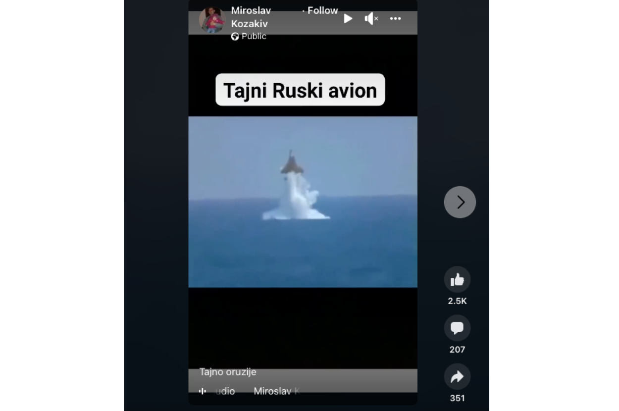 Na snimku koji se raširio na Fejsbuku vidi se avion koji izleće iz vode i probija se kroz guste oblake dima. Deli se uz tvrdnju da prikazuje „tajno rusko oružje”.