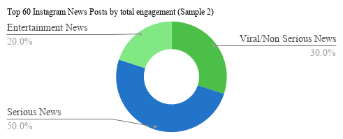 Posmatrajući prvih 60 najpopularnijih postova na ovoj društvenoj platformi u toku 14 dana, otkriveno je da polovina postova spada u vesti ozbiljnog sadržaja, dok su kategorije zabavnih i viralnih vesti zajedno činile ostalih 50 odsto ukupnog udela.