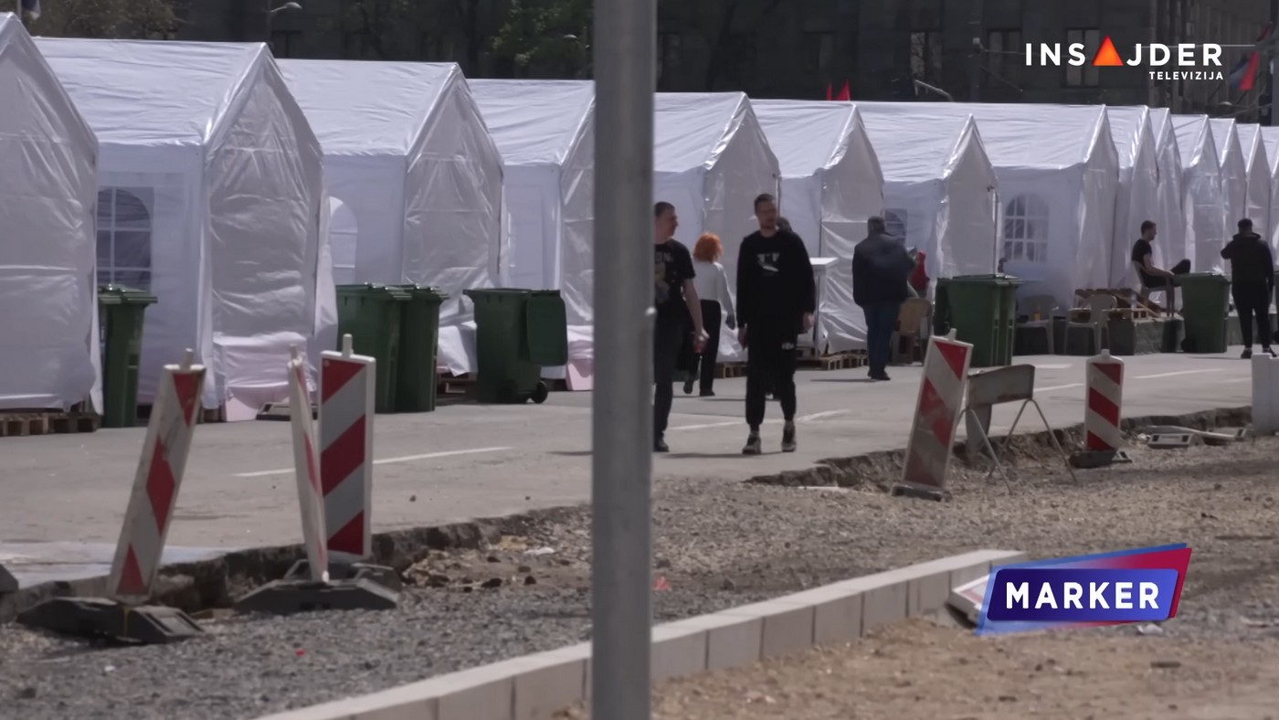 Beli šatori, uglavnom prazni, u ponekom nekolicina ljudi. Postavljeni su prvo 11. aprila pred skup vlasti pod nazivom “Ne damo Srbiju”. Skup je završen 13. aprila, oni su sklonjeni a onda ponovo postavljeni dan pred sednicu skupštine 15. aprila, malo pošto su studenti iznenada blokirali RTS.
