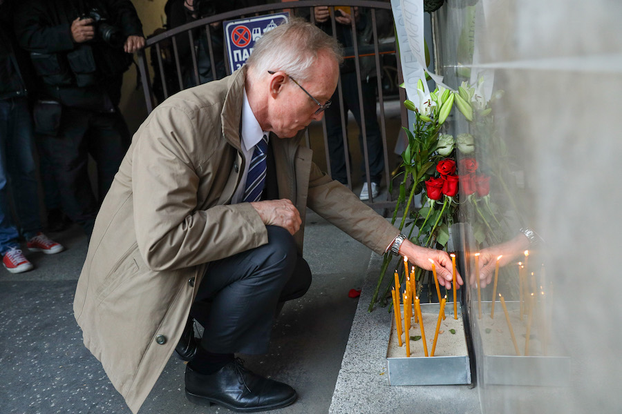 Ispred restorana Kolarac u Knez Mihailovoj ulici u Beogradu okupili su se novinari, predstavnici međunarodnih organizacija koje se bave zaštitom novinara i medijskim slobodama, kolege i prijatelji, poštovaoci Slavka Ćuruvije.