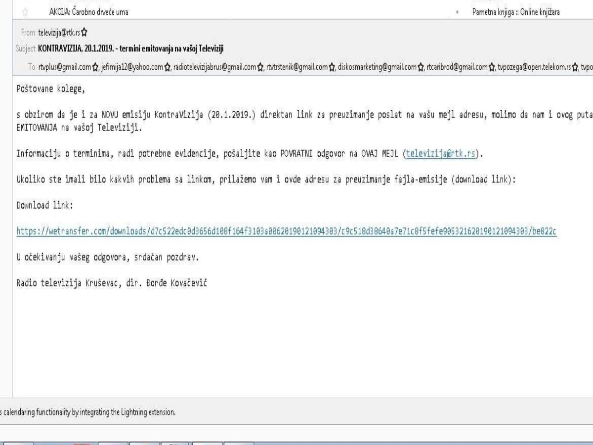 Na adrese lokalnih televizija, kako se vidi u mejlovima, najčešće stiže obaveštenje da je obavezno emitovati emisiju “Kontravizija” i traži se povratna informacija o terminima, kao i potvrde da je emisija emitovana.