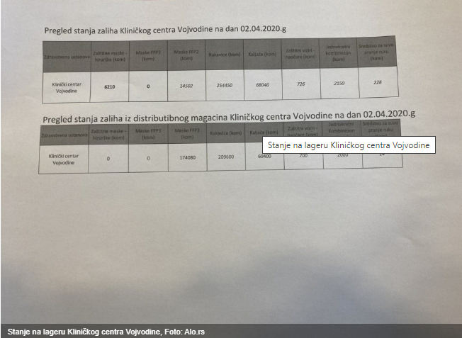 Bilo je zanimljivo i to što se dan nakon objavljivanja teksta Ane Lalić „KC Vojvodine pred pucanjem: Bez zaštite za medicinske sestre“, u onim tabloidima koji su oštro kritikovali „lažnu vest“ pojavila tabela koja bi valjda trebalo da posluži kao dokaz da sve potrebne opreme ima dovoljno i da su navodi novinarkinih izvora netačni. Kreatorima tabloida nije smetalo to što na pomenutom papiru sa tabelom nije bilo nikakvog pečata KCV-a ili pak potpisa nekog od nadležnih kojim bi se potvrđivala njegova autentičnost – oni su te podatke sa papira predstavili kao ultimativni dokaz.