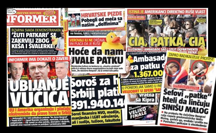 „Neki od naslova kojim su pokušali da nas diskredituju bili su: ‘Ubijanje Vučića’, ‘Šefovi žute patke hteli da linčuju Sinišu Malog’, ‘Kreće nasilje u Srbiji!’, ‘Soroš za haos u Srbiji dao skoro četiri miliona evra’, ‘Žuta patka hoće i da bije’, ‘Stranci daju milione za lažne afere u Srbiji’, ‘NATO podržao žutu patku'“, podseća se u saopštenju.