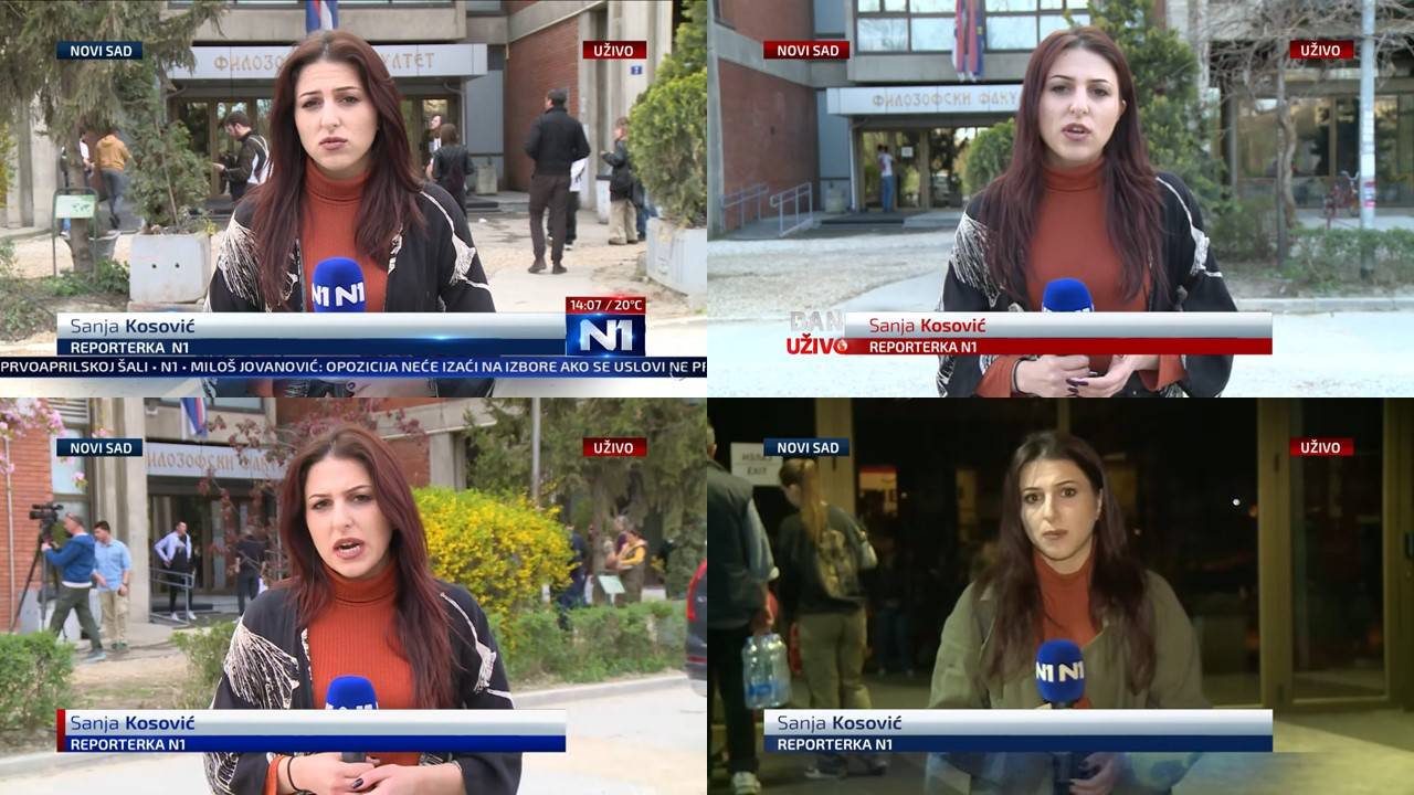 Redakcija FakeNews Tragača pregledala je sve materijale iz informativnih emisija N1 koji su se ticali nedavnih skupova na Filozofskom fakultetu u periodu od 27. do 29. marta. Radi se o dva skupa podrške akademskom integritetu i profesoru Dinku Gruhonjiću (27. i 29. mart) i skupu mladića i studenata koji su protestovali zbog govora mržnje ovog profesora, a potom otpočeli blokadu Filozofskog fakulteta (28. mart). Uvidom u emisije dostupne na Jutjubu i na platformi EON zaključili smo da sa ovih događaja ni u jednom trenutku nije izveštavala novinarka N1 Ksenija Pavkov, već reporterka ovog medija Sanja Kosović.