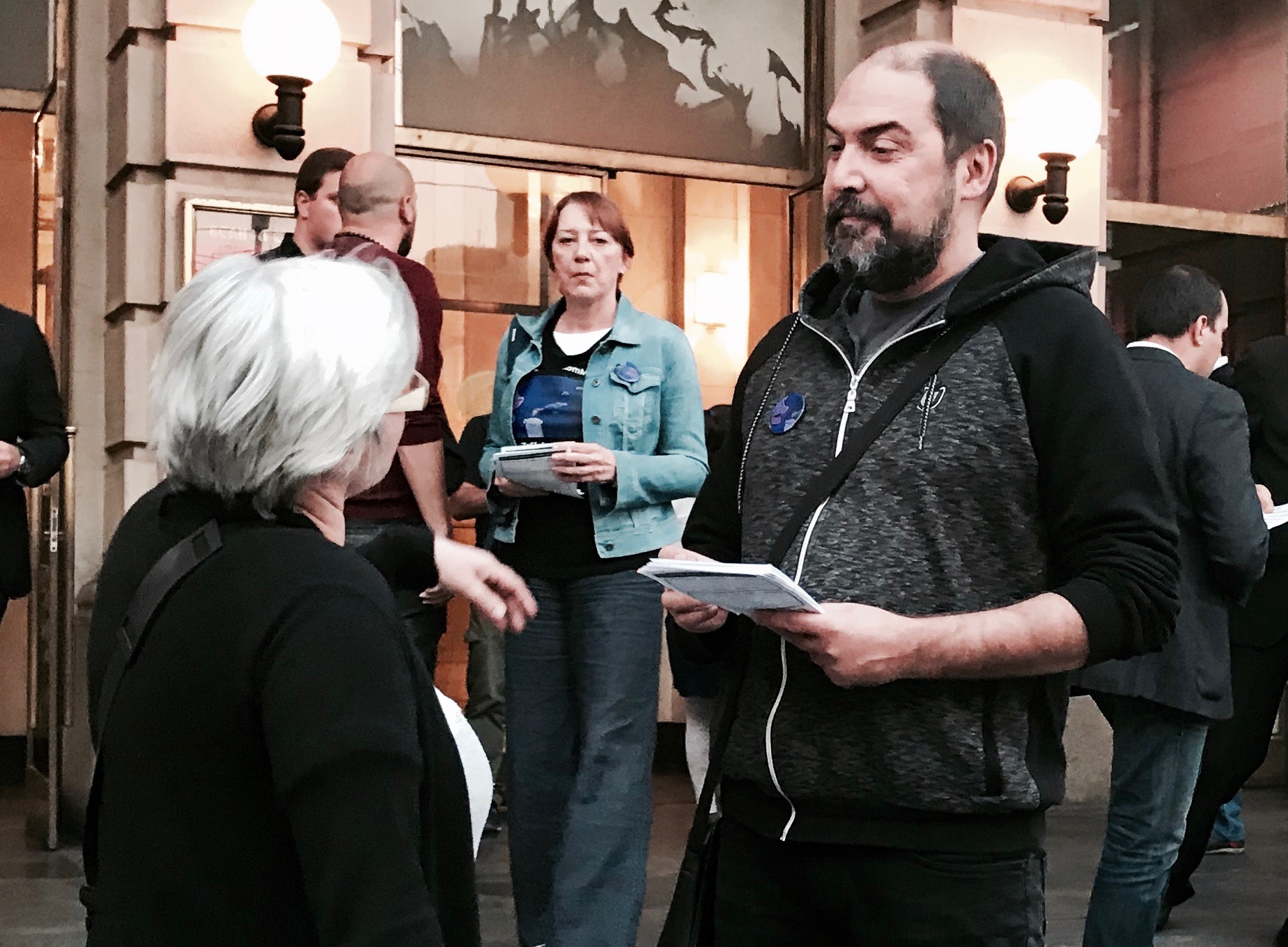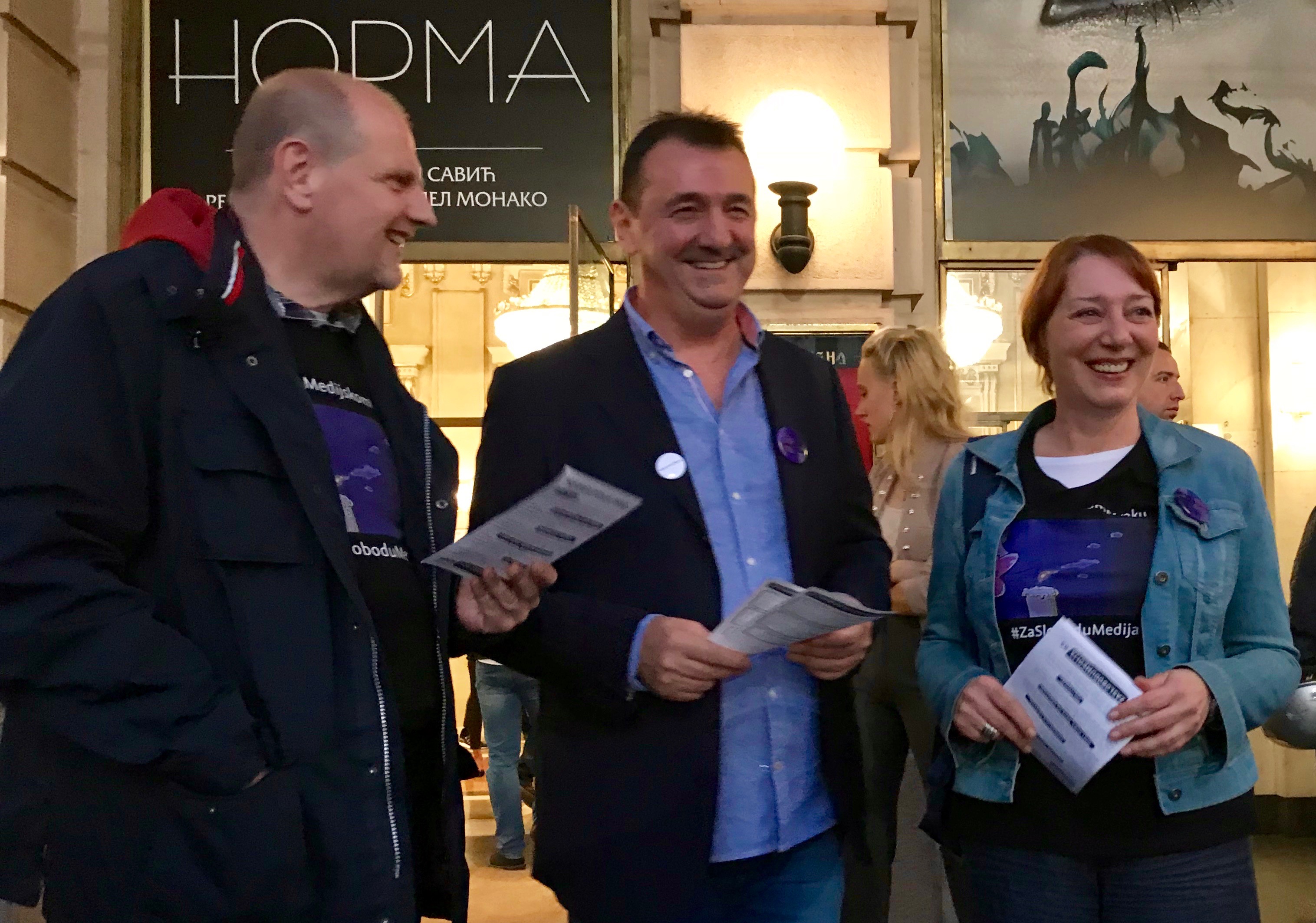 Novinarke i novinari, među kojima su bili i Antonela Riha, Draža Petrović, Tamara Spaić, Slaviša Lekić, Jasmina Dobrilović, Dušan Mašić, Perica Gunjić, Dragan Popović kao i Maja Stojanović iz nevladine organizacije Građanske inicijative, nenajavljeno su se pojavili ispred pozorišta i podelili nekoliko stotina letaka građanima i zvanicama, među kojima i predstavnicima Grada, ministrima, ambasadorima i drugim gostima.