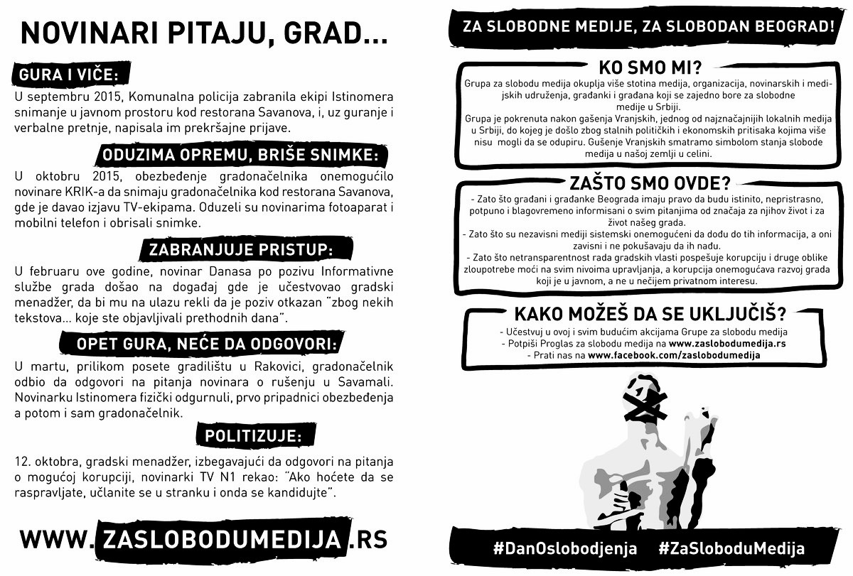 Na ovu su se akciju odlučili, kako piše u letku, zato što „građanke i građani Beograda imaju pravo da budu istinito, nepristrasno i blagovremeno informisani o svim pitanjima od značaja za njihov život i žitov grada“, zato što su „nezavisni mediji sistematski onemogućeni da dođu do tih informacija“, kao i zato što „netransparentnost rada gradskih vlasti pospešuje korupciju i druge oblike zloupotrebe moći“.