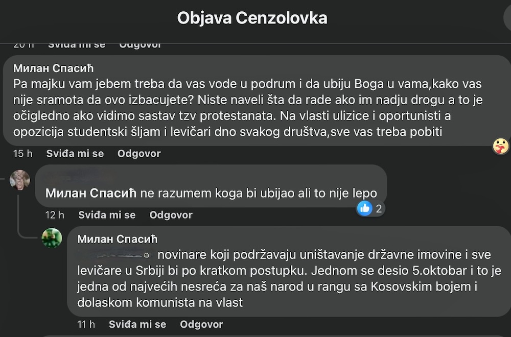 Snimak ekrana pretnje na Fejsbuk strani Cenzolovke