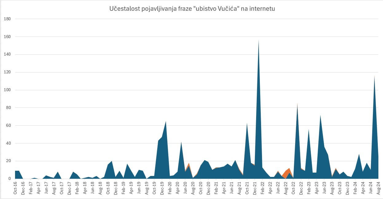 Upravo su to bile nedelje kada upotreba sintagme „ubistvo Vučića”, prema podacima platforme Ahrefs, doživljava vrhunac na domaćem internetu, što u tabloidima, što u medijima koji kritikuju vlast.