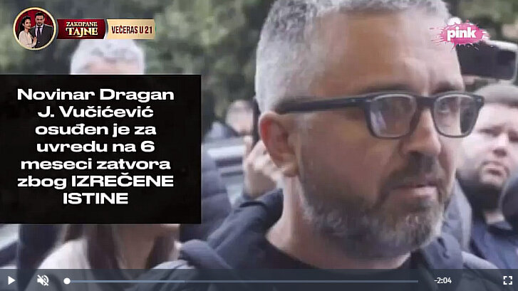 „Novinar Dragan J. Vučićević osuđen je za uvredu na šest meseci zatvora zbog izrečene istine. ‘Kolege’ koje danas seire nad Vučkovom sudbinom i dalje su na slobodi. Iako su dosad objavili i izrekli stotine laži i uvreda na račun Aleksandra Vučića“, piše na samom početku emitovanog snimka.