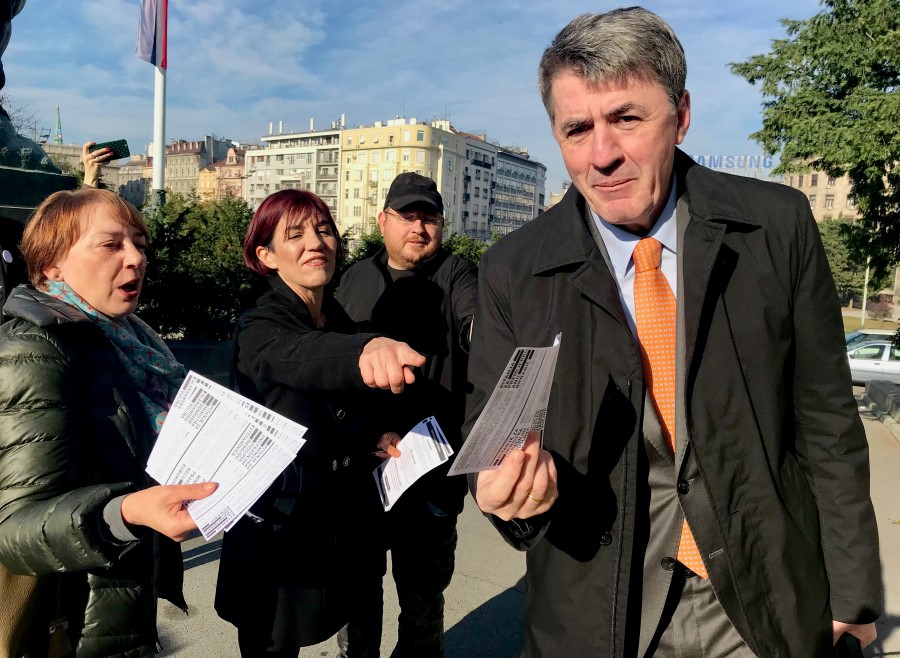 Antonela Riha, Danica Vučenić i Marko Somborac uručuju letak Žarku Obradoviću (Foto: P. Gunjić / Cenzolovka)
