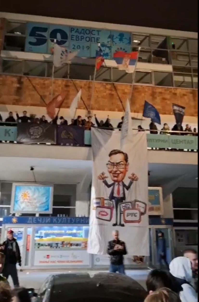Studenti koji trenutno blokiraju zgradu Radio- televiziju Srbije (RTS) u Takovskoj ulici razvili su sa zgrade veliki transparent na kom predsednik Srbije Aleksandar Vučić koncima drži televizije Happy, Pink, B92, Studio B, Prvu i RTS, prenosi FoNet.