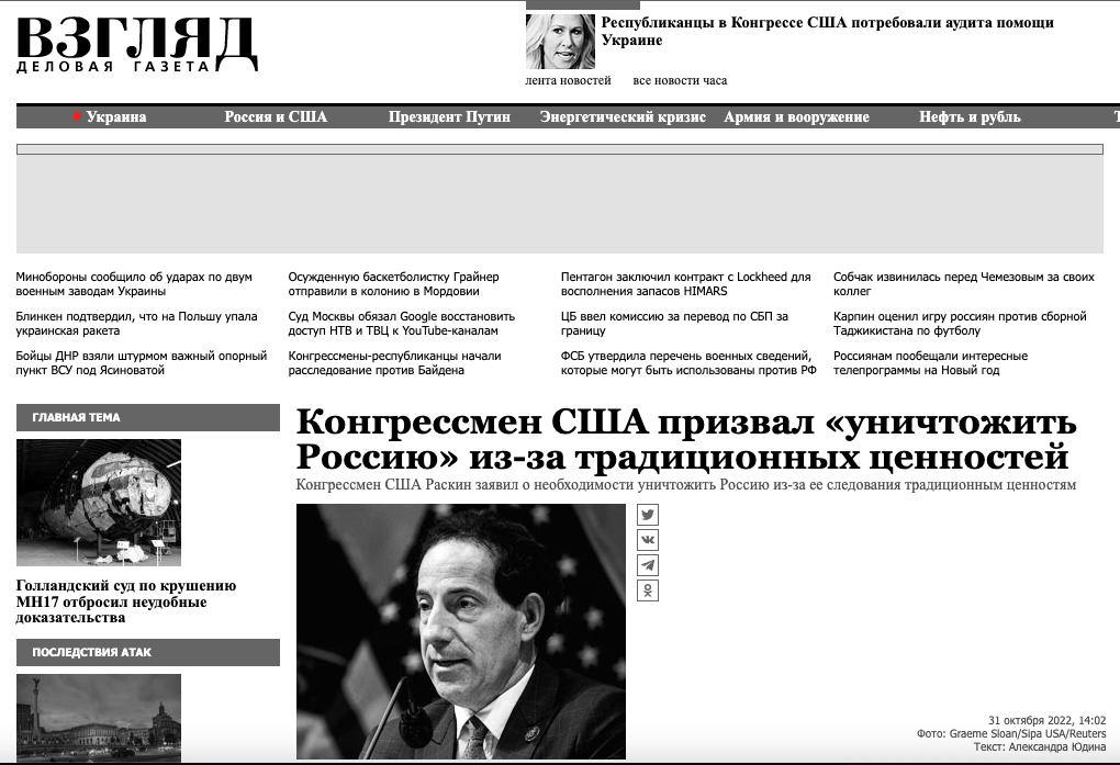 Kako su naveli, „američki kongresmen iz Demokratske stranke Džejmi Raskin dotakao se nedavno situacije u Ukrajini i poručio da ‘Rusiju treba uništiti po svaku cenu, jer je pravoslavna zemlja s tradicionalnim vrednostima’.”