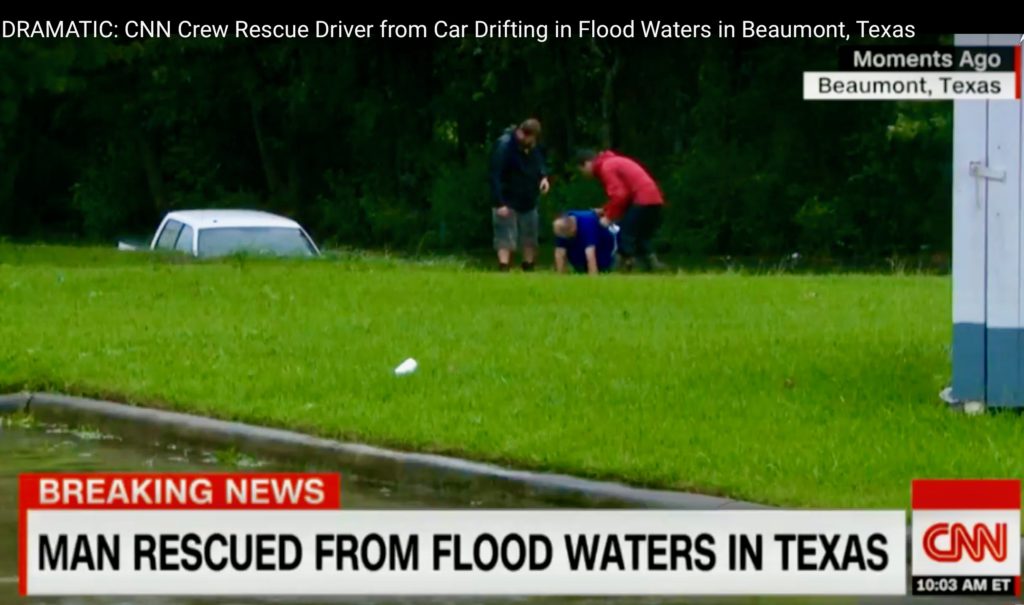 Kamere su ulovile trenutak kad je sa snimateljima izvlačio muškarca iz vode, dok mu vozilo nosi voda. Sve se dogodilo u samo nekoliko sekundi, a spašeni vozač, kasnije identificiran kao Jerry Sumrall, koji se također pojavio u javljanju uživo, rekao je da je mislio da prilazi cesti koja je samo na površini prekrivena vodom i da nije znao da ulijeće ravno u bujicu.