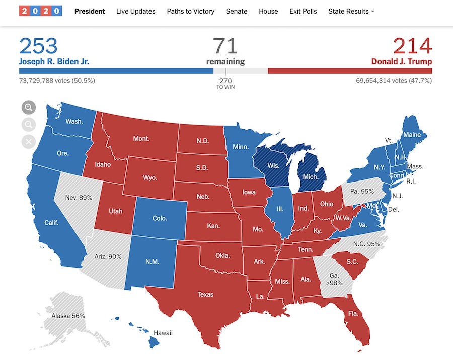 Dok i pojedini mediji u Srbiji od srede objavljuju kako Bajden ima sigurna 264 elektorska glasa, Njujork tajms i CNN dva dana kasnije, u petak ujutro, objavljuju samo proverene podatke – da je Bajden zvanično osvojio 253 glasa (foto: snimak ekrana portala Njujork tajmsa, 6. 11. u 10 sati)