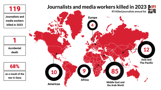 U IFJ, koji je objavio inicijalni popis ubijenih novinara uoči Dana ljudskih prava UN-a 8. prosinca, dokumentirajući 94 ubojstva, kažu da je najnoviji porast rezultat dodatnih smrtnih slučajeva u ratu u Gazi, kao i drugih ubojstava o kojima su dobili podatke.