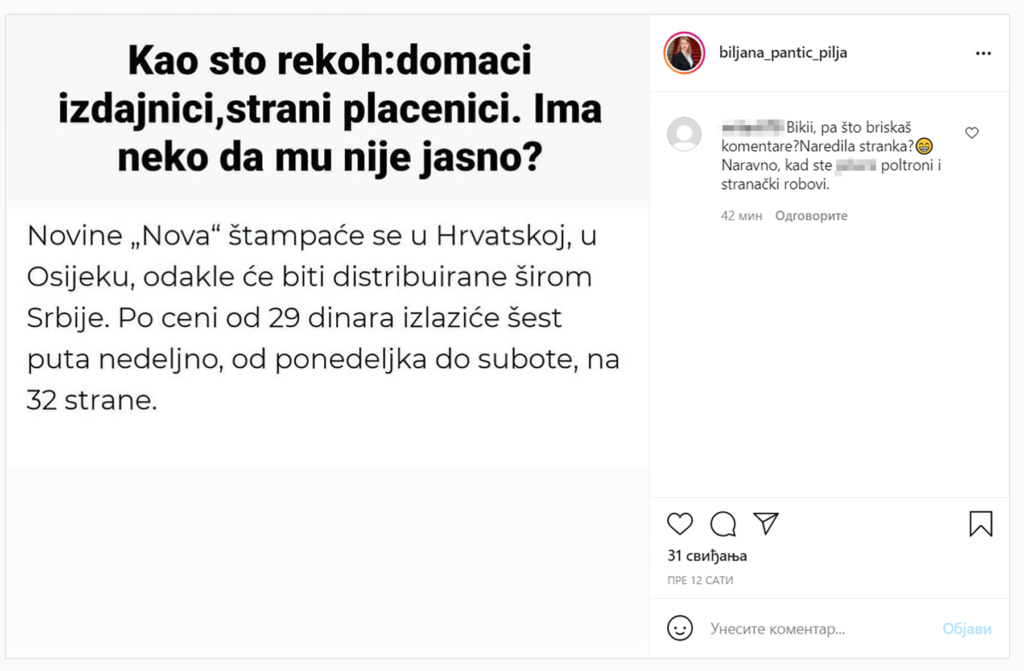 Predsednik Srbije Aleksandar Vučić izjavio je danas da je zamolio poslanicu Srpske napredne stranke (SNS) Biljanu Pantić Pilju da sa društvenih mreža ukloni svoju objavu u kojoj novinare portala nova.rs naziva "domaćim izdajicima" i "stranim plaćenicima".