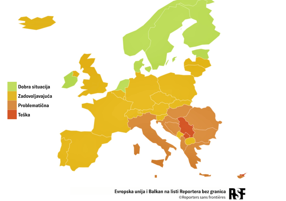 Reporteri bez granica u Svetskom indeksu medijskih sloboda 2023. Srbiju svrstavaju među "problematične države". Dok su medijske slobode u Severnoj Makedoniji, Crnoj Gori i Hrvatskoj na višem nivou nego u SAD, na Balkanu od Srbije gore stoje Albanija i Grčka. Prijatelji srpskih vlasti, Ujedinjeni Emirati, Rusija i Kina, i dalje među najmračnijim državama sveta kada je odnos prema novinarima u pitanju