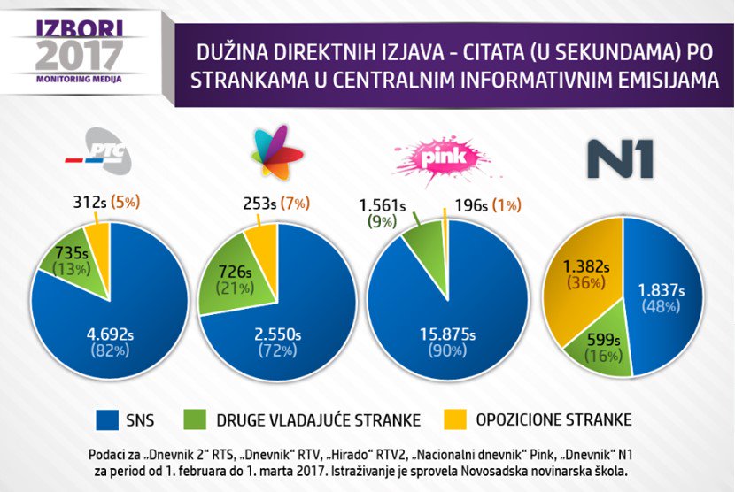 Kako je saopšteno, najveći balans kada je u pitanju dužina izjava predstavnika vladajućih stranaka i opozicije uočena je na N1 televiziji, a najmanji na Pinku. „Predstavnici SNS-a su na televiziji Pink pričali gotovo 16.0000 sekundi, tj. 260 minuta, tj. zbirno posmatrano čitavih devet „Nacionalnih dnevnika“. U jednom od njih (17. februar) emitovana su tri minuta…