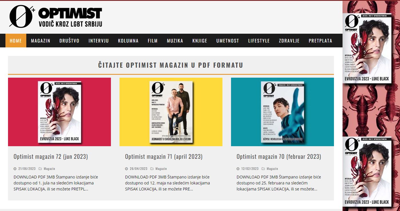 Optimist magazin je neprofitni magazin koji se besplatno distribuira u Beogradu, Novom Sadu, Nišu i drugim gradovima u Srbiji, dok je u PDF formatu dostupan na sajtu www.optimist.rs