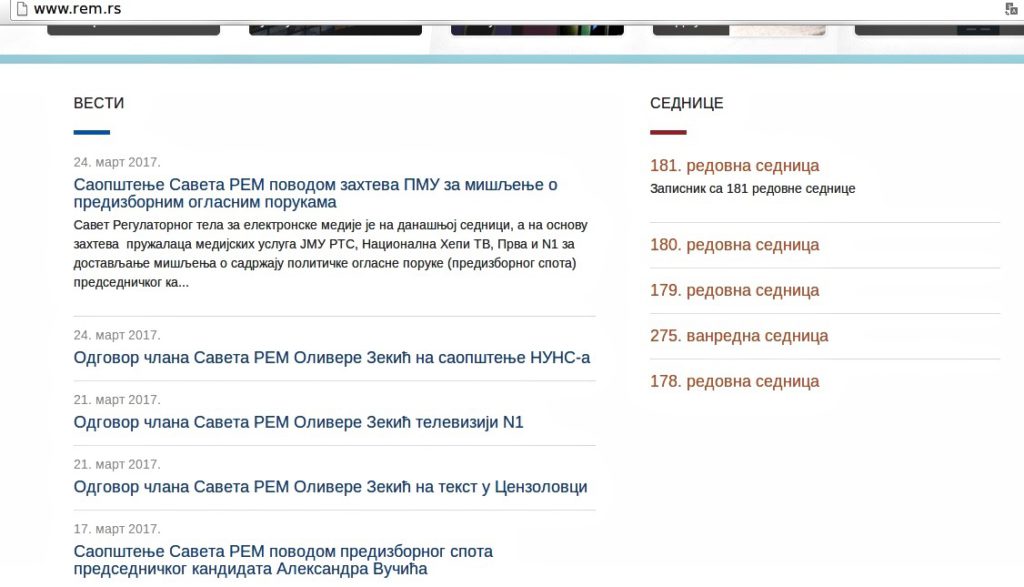 U svemu ovome, zanimljivo je da Oliveri Zekić ovo nije prvi put da se poigrava svojom pozicijom i ovlašćenjima, odnosno da kapacitete REM-a koristi za iznošenje ličnih stavova. Pre nepunih godinu dana, u toku kampanje za predsedničke izbore, od ukupno pet vesti na naslovnoj strani sajta REM-a (videti skrinšot iznad), tri su zapravo bile saopštenja Olivere Zekić upućena televiziji N1, NUNS-u i Cenzolovci – a sve povodom jednog priloga i jednog teksta koji joj se nisu dopali, i na čije je navode odgovorila.