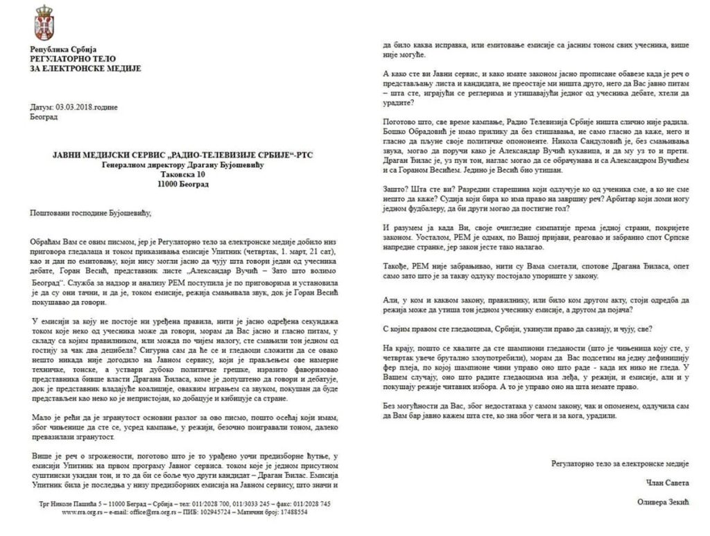 Ne, doduše, „glavom i bradom“, ne u ime čitavog Saveta REM-a, ne na osnovu nekakve odluke koju su doneli, već u otvorenom pismu članice Saveta REM-a Olivere Zekić upućenom generalnom direktoru RTS-a Draganu Bujoševiću.