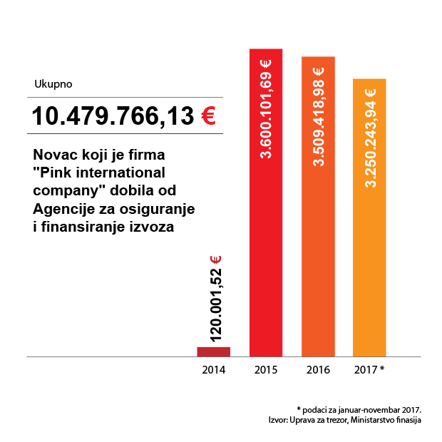 Firma Željka Mitrovića, Pink international company, dobila je prošle godine nešto više od 3,2 miliona evra (402.705.225 miliona dinara) od državne Agencije za osiguranje i finansiranje izvoza(AOFI), pokazuje dokumentacija Uprave za trezor do koje je došao Centar za istraživačko novinarstvo Srbije (CINS).