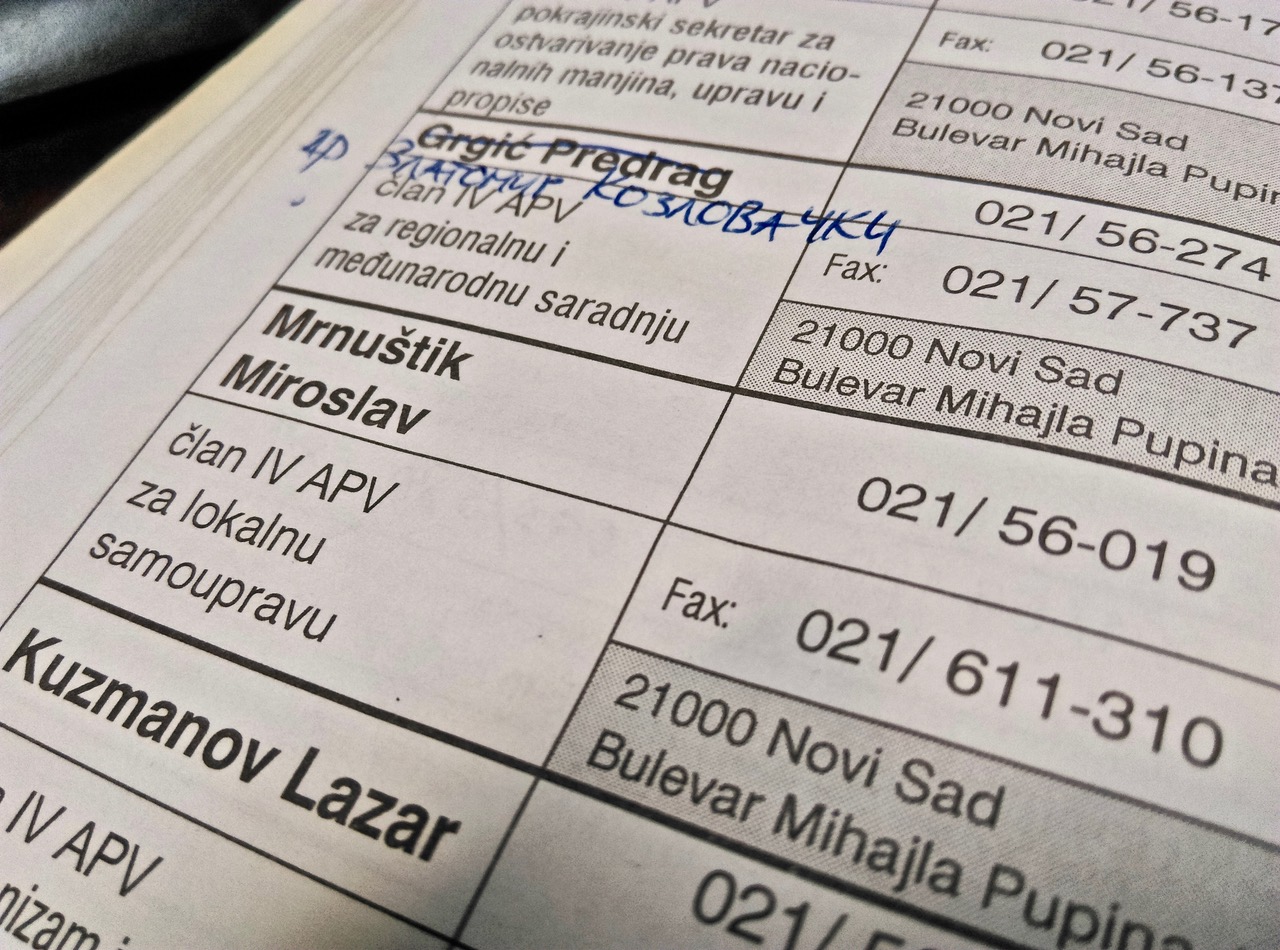Prvi među mnogima bio je Nenad Čanak, tada predsednik Pokrajinske skupštine. Pored njegovog imena stoji broj telefona na poslu, adresa na kojoj može da se nađe tokom radnog vremena, i broj mobilnog telefona. Odmah posle njega je tadašnja potpredsednica Skupštine Vojvodine Gordana Čomić, a uz njeno ime broj telefona na poslu, broj mobilnog i kućnog telefona i adresa stanovanja.