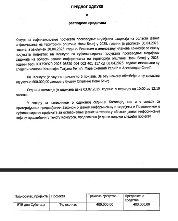 Od ukupno šest pristiglih prijava, komisija je ocenila da samo jedna ispunjava uslove za finansiranje. Među odbijenima je i portal Webinfo – jedan od svega dva lokalna medija koji svakodnevno izveštavaju sa teritorije opštine Novi Bečej. TV Novi Bečej je dobio sredstva. Webinfo – nije.