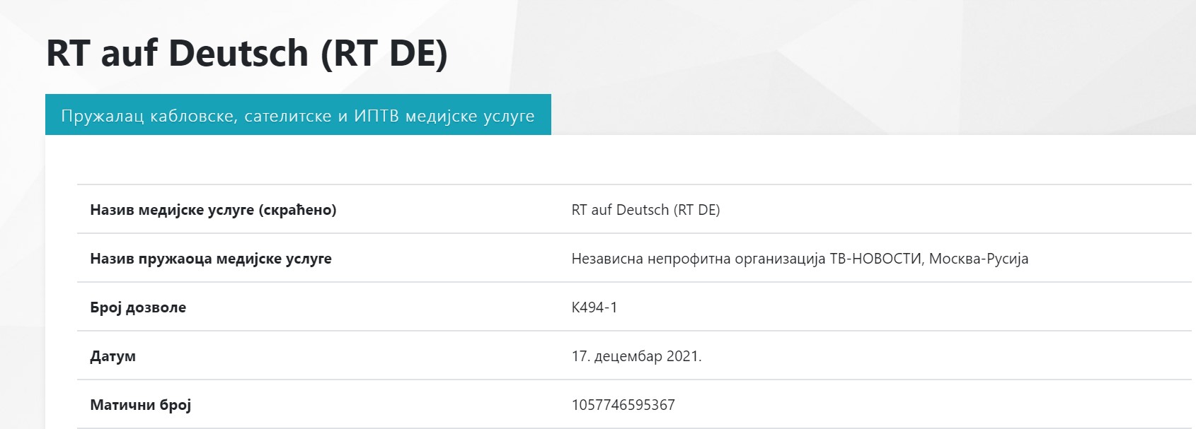 Na sajtu Regulatornog tela za elektronske medije objavljeno je da je 6. decembra ove godine izdata dozvola za emitovanje programa u kablu mediju RT auf Deutsch, piše Cenzolovka. Tog dana održana je 408. vanredna sednica Saveta REM-a. U dnevnom redu koji je objavljen na sajtu nema reči o ruskom mediju.
