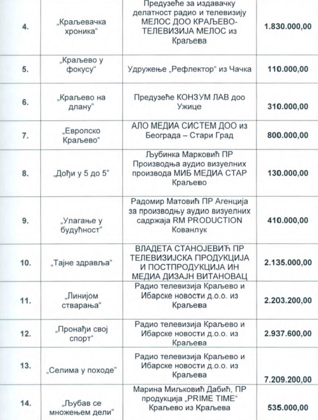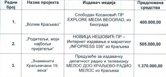 Ugrenović je još ukazao da pojedini mediji van Kraljeva svake godine dobijaju sredstva iz našeg budžeta, a pojedini kraljevački svake godine – bivaju odbijeni. Ovo je spisak medija i projekata, kao i iznosi sa kojima će biti sufinansirani: