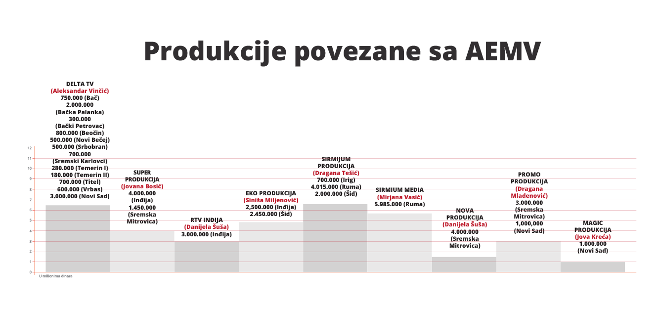 Od toga 13 komisija u kojima su sedeli predstavnici AEMV dodelile su 39,1 milion dinara produkcijama u vlasništvu članova Asocijacije, televiziji Aleksandra Vinčića i osobama koje su sa njim povezane.