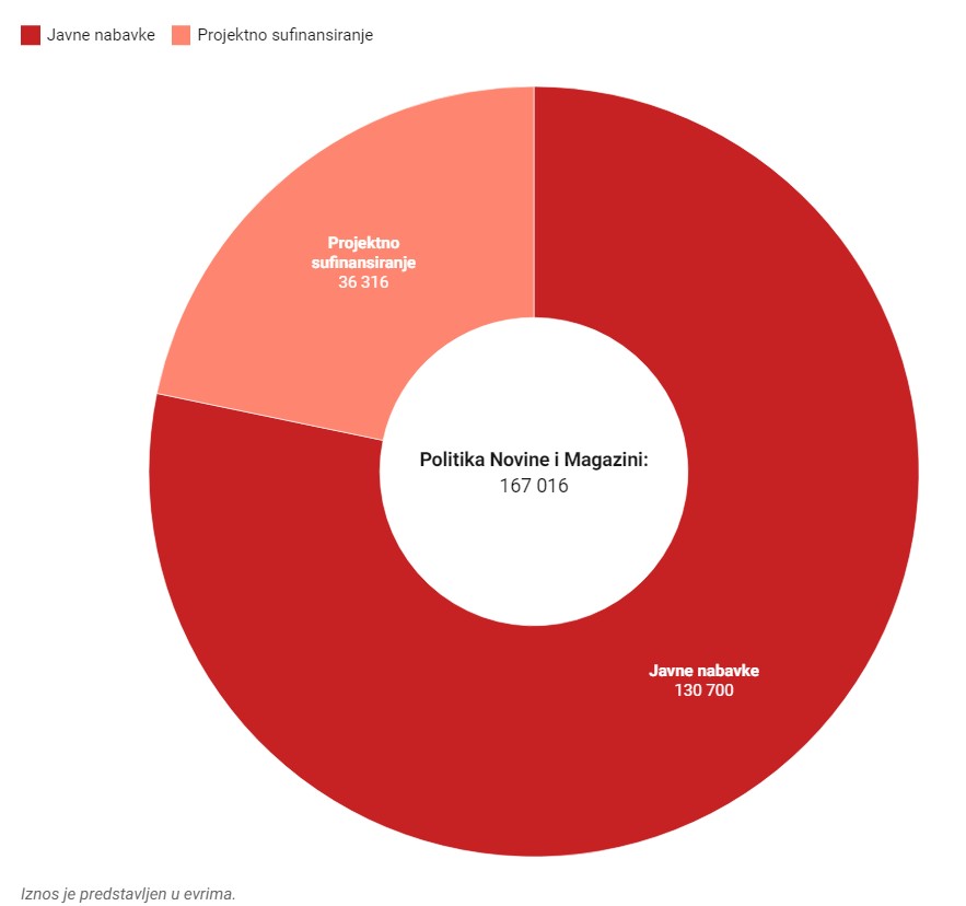 Veći deo, 130 hiljada evra, Politika je dobila od javnih nabavki, odnosno preko tendera za oglašavanje. Njeni najveći partneri bili su Javno preduzeće „Pogrebne usluge“ (45.000 evra), Direkcija za građevinsko zemljište (oko 30.000 evra) i RTS sa kojima su potpisali 20 hiljada evra vredan ugovor o oglašavanju.