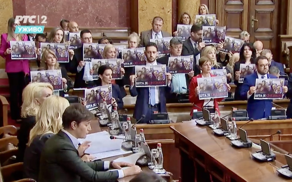 Dok su poslanici opozicije mahali štampanim izdanjem Informera, koji je opoziciju optužio da preti ubistvima i silovanjem dece, tokom direktnog prenosa, reditelj RTS-a se trudio da se naslovna strana tabloida – ne nađe u kadru