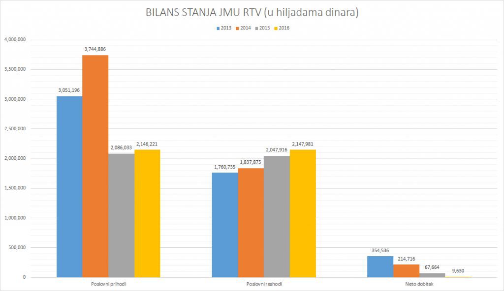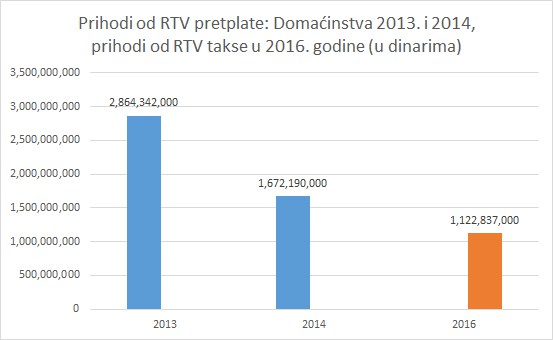 U brojkama to izgleda ovako: RTV je od TV pretplate 2013. godine zaradio 2,86 milijardi dinara, a godinu dana kasnije ukupan prihod bio je 1,67 milijardi upravo iz razloga što je u avgustu obustavljena TV pretplata. Naredne 2015. TV pretplate nije bilo, a uvođenjem TV takse 2016. RTV je zaradio 1,12 milijardi dinara.