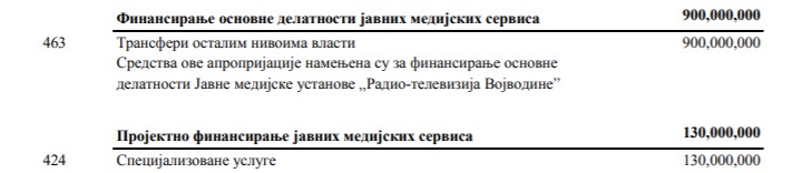 U stavci „finansiranje osnovne delatnosti javnih medijskih servisa”, za to je namenjeno 900 miliona dinara, ali jedino “za finansiranje osnovne delatnosti Javne medijske ustanove Radio-televizija Vojvodine”, dok se Radio-televizija Srbije uopšte ne pominje.
