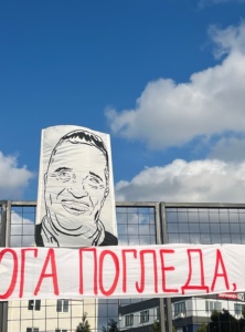 Transparent sa likom Dragana J. Vučićevića na studentskom protestu ispred Informera (foto: Danica Đokić / Cenzolovka)