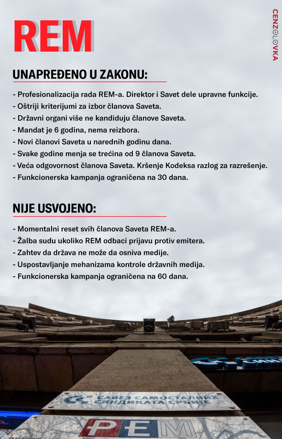 Veliki broj od 130 članova finalnog nacrta Zakona o elektronskim medijima (ZEM), usvojenog 26. oktobra u Skupštini Srbije, tiče se rada Regulatornog tela za elektronske medije (REM). Medijska zajednica je podržala najveći deo izmena, ali neke važne promene, poput „resetovanja“ rada REM-a, na kraju su bile plod kompromisa. Pojedini predlozi medijske zajednice, koje predviđa i ranije usvojena Medijska strategija, kao što je potpuno povlačenje države iz medija – nisu prošli.